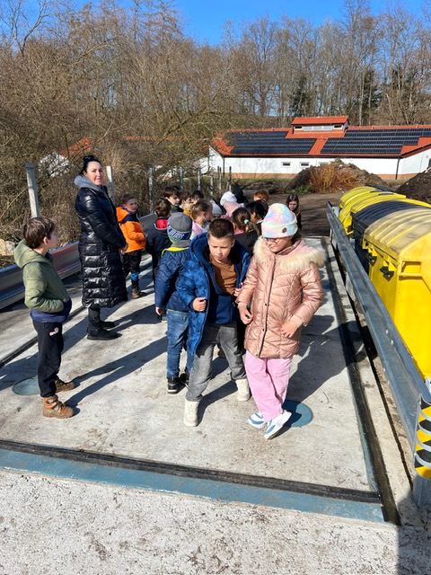Pro 2.B bylo spouštěcím momentem nové téma v prvouce Třídíme odpad. V duchu jsem se rozhodovala, jestli téma probereme ve třídě s dobře nashromážděným a namíchaným materiálem nebo využijeme kontejnery u městského úřadu. Ale nádherný den plný předjarního slunce rozhodl, že uděláme pár kroků navíc a dojdeme si k čističce odpadních vod, kde je i sběrný dvůr. Hned ve vratech jsme narazili na Ondru Zeleného, který to tam má na starosti, a protože jsme návštěvu nehlásili, trochu jsem zaváhala. On také, když viděl 22 blech a dvě pančelky, ale zachovali jsme důstojnost. Kluci obdivně zírali na kolový nakladač, ze kterého Ondra sestoupil a já jsem klidné atmosféry využila k prosbě o vysvětlení, co jsou ty hromady rozdrceného bio materiálu. Ondra podal dětem věcné a praktické vysvětlení a zodpověděl pár zvídavých otázek. Několik dětí se rozhodlo stát se řidičem vozu s drtícím zařízením. Přešli jsme ke žlutému a modrému poli popelnic a kovovým obalům, to jsme dobře znali, kontejner na textil spustil diskuzi o tom, co se stane, když tam našinec spadne, sběr oleje děti dost udivil a nadchly je kontejnery na velký odpad, jak dřevěný, tak smíšený. Pak jsme se zastavili (stále doprovázeni Ondrou) u takového kusu silnice s ocelovými svodidly. Dala jsem lišáckou otázku, co to asi je? Padaly různé legrácky, až jsme se dostali k „nějakej průjezd k čističce“. Když jsem prozradila, že je to váha, nastalo divení a Ondra navrhl, že nás zváží. K tomu zvážení musel odejít, 2.B mezitím tipovala. Počítáme do 100, tak nejvyšší tip byl 170 kg. Tipnete si, kolik váží 2.B?