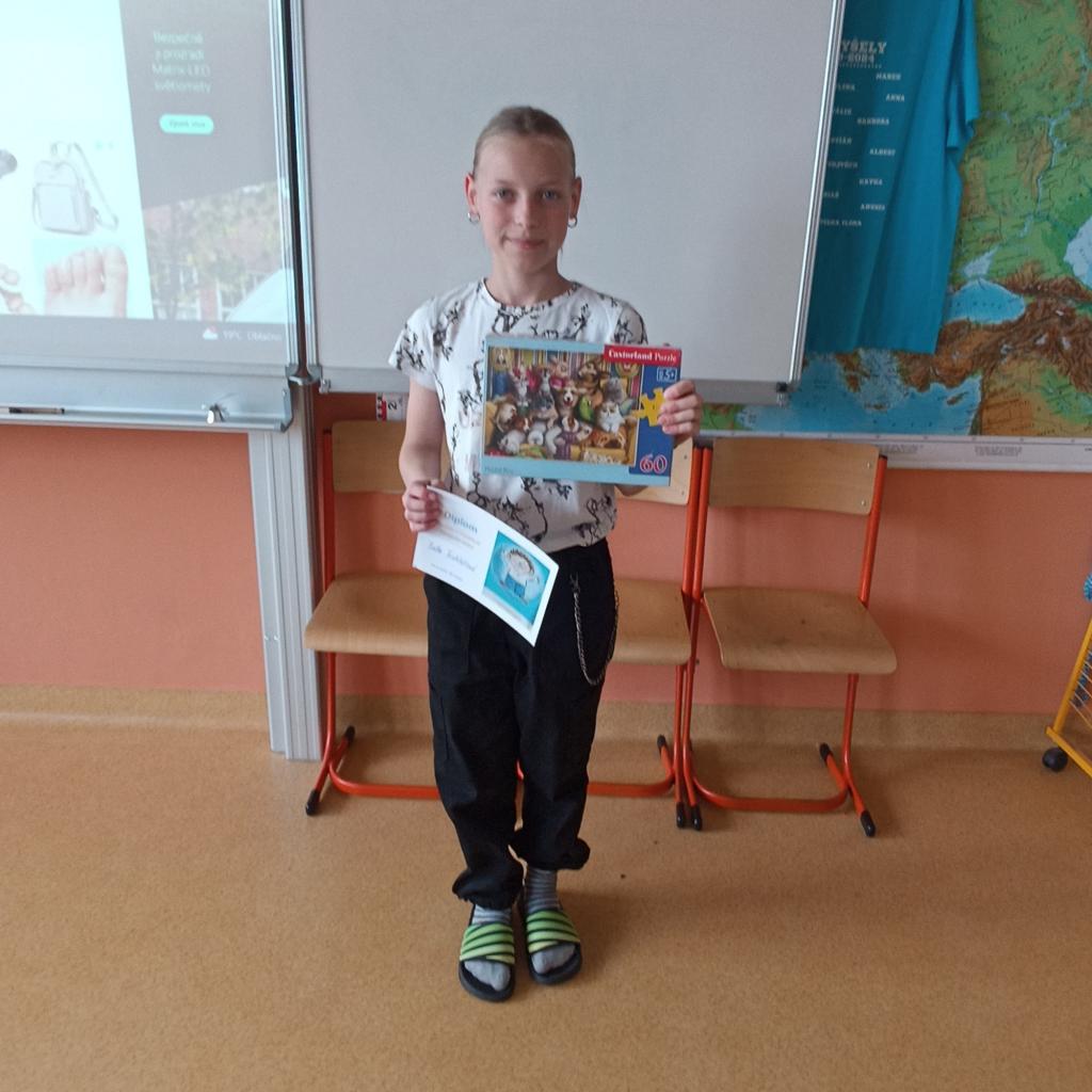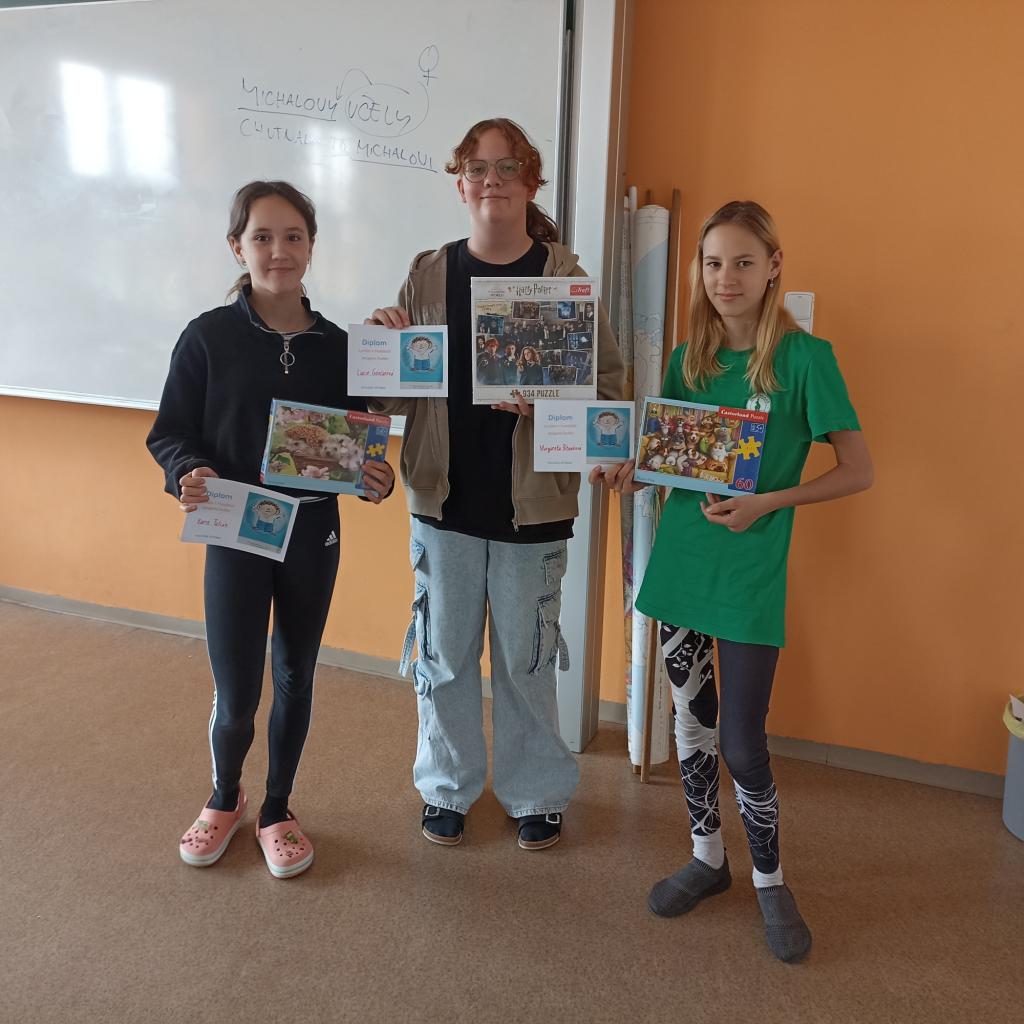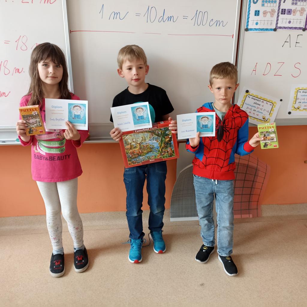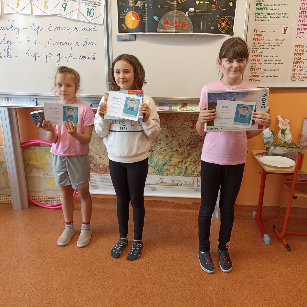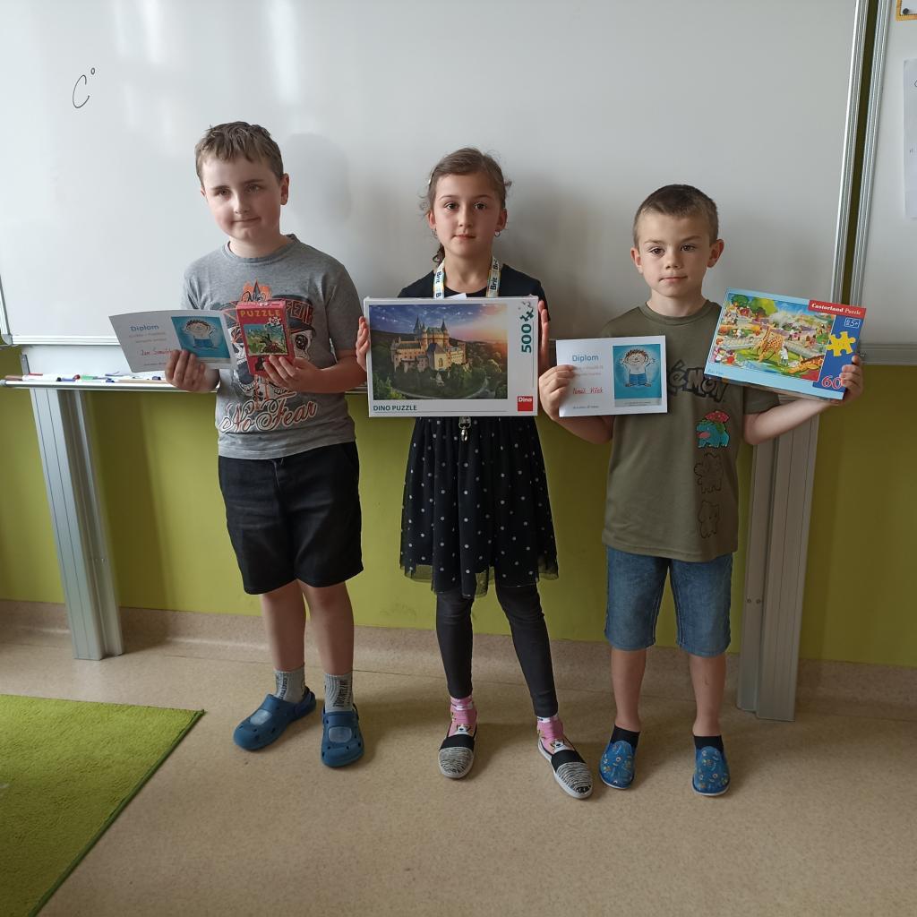 Nejúspěšnějším žákům byly v pátek předány diplomy a ceny zakoupené KRPŠ. Za to jim patří poděkování pořadatelů i soutěžících. Vítězové prvních míst si odnesli Puzzle s 1 000 dílky, mladší pak pětistovkové a stovkové. Ale ani žáci na druhých a třetích místech nebyli určitě zklamaní. Poděkování patří také děvčatům z 6.A, která se postarala o kvalitní mobilní časomíru.